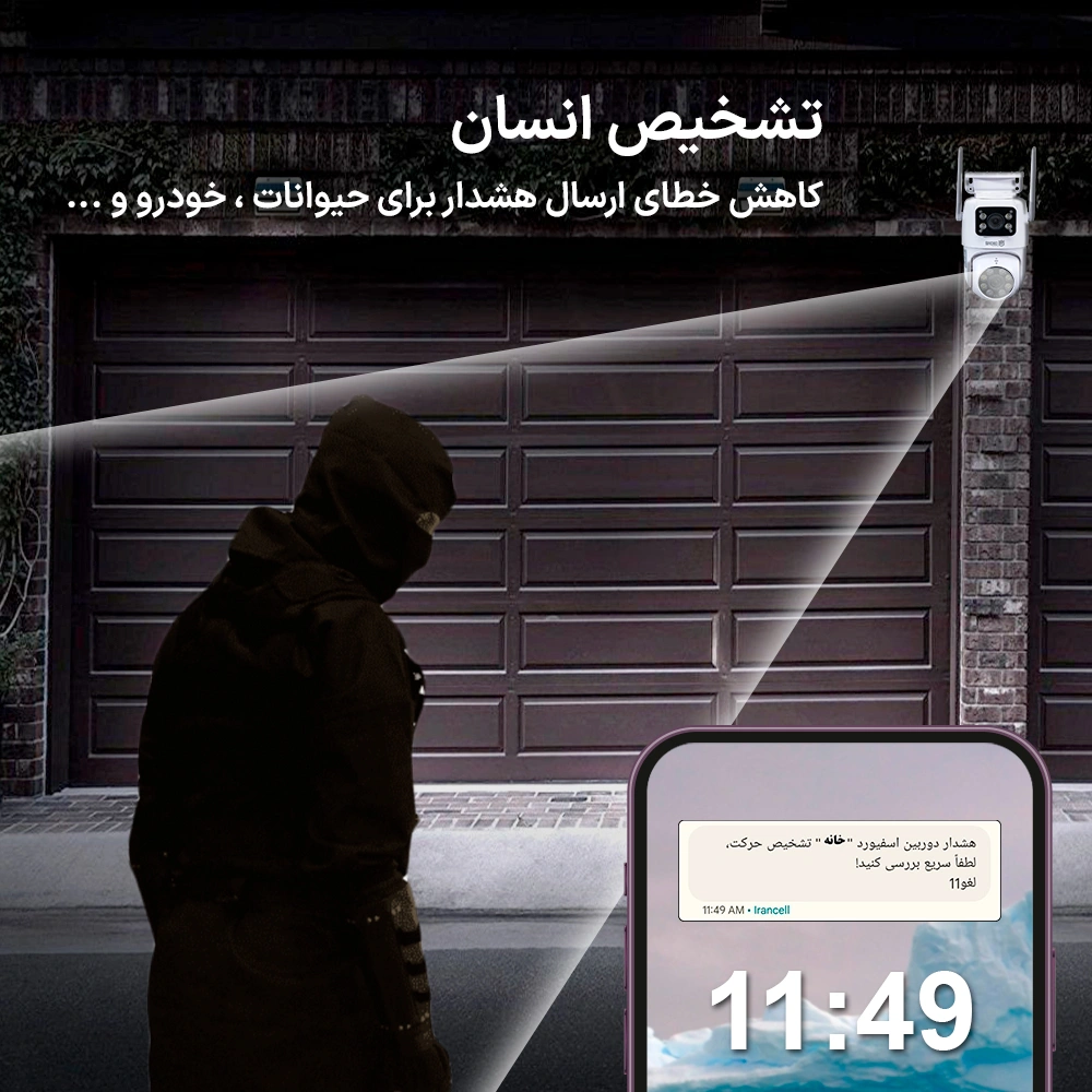 این محصول مجهز به سیستم دزدگیر با تشخیص انسان و ارسال پیامک هشدار است که در صورت تشخیص حرکتی مشکوک، فوراً شما را آگاه میکند.🚨